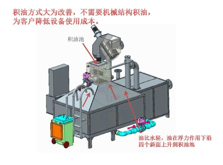 該油水分離裝置主要利用油與水的比重不同,油比水輕,油在浮力作用下沿著隔油池斜面上升到集油池,油集聚到一定的量而自動排出,分離后的水從另一端(提升站)排出,從而實(shí)現(xiàn)餐飲廢水以及其它油污廢水的油水分離,進(jìn)而實(shí)現(xiàn)油品綜合利用,外排廢水動植物油的含量達(dá)到環(huán)保標(biāo)準(zhǔn)。