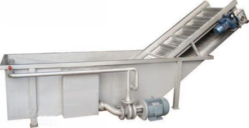 該機由機架、水箱、風(fēng)機、提升機、氣泡管、噴水管等幾部分組成,工作時由于水中風(fēng)力的存在,蔬果在水中任意方向翻滾轉(zhuǎn)動,并在高壓水力的推動下向前移動,在出口由一刮板提升機,將果蔬送至下道工序。整體為分體式結(jié)構(gòu),水箱與輸送機、進(jìn)出料斗、罩板方便拆卸,易于清洗和檢修。