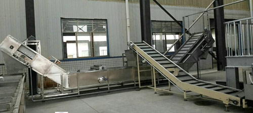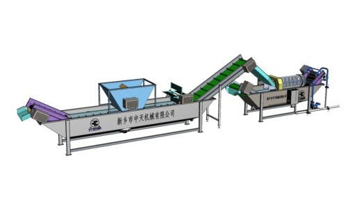 漂浮在水面的輕物質(zhì)由翻板推送到出料輸送帶,往水下沉的重物質(zhì)有水槽底部的輸送帶從另一端輸送提升到滾筒清洗機,重物質(zhì)中的小顆粒雜質(zhì)會從滾筒清洗機的滾筒網(wǎng)中漏下,往水下沉,沉到清洗機底部的輸送帶上,由輸送帶從另一端送出去。清洗后的物料由清洗機自帶的提升機提升到擠壓分離機中進行榨汁。