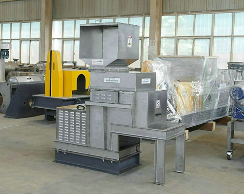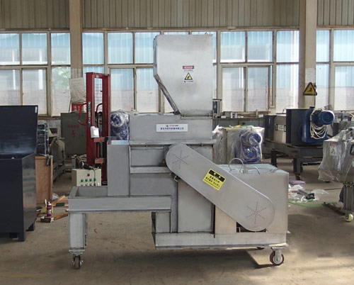 2、針對長纖維物料全自動輸送帶壓輥進(jìn)料,壓輥可根據(jù)物料的厚度自動升降,出料螺旋輸送。特別適合大批量作業(yè),可以抓車、鏟車上料。